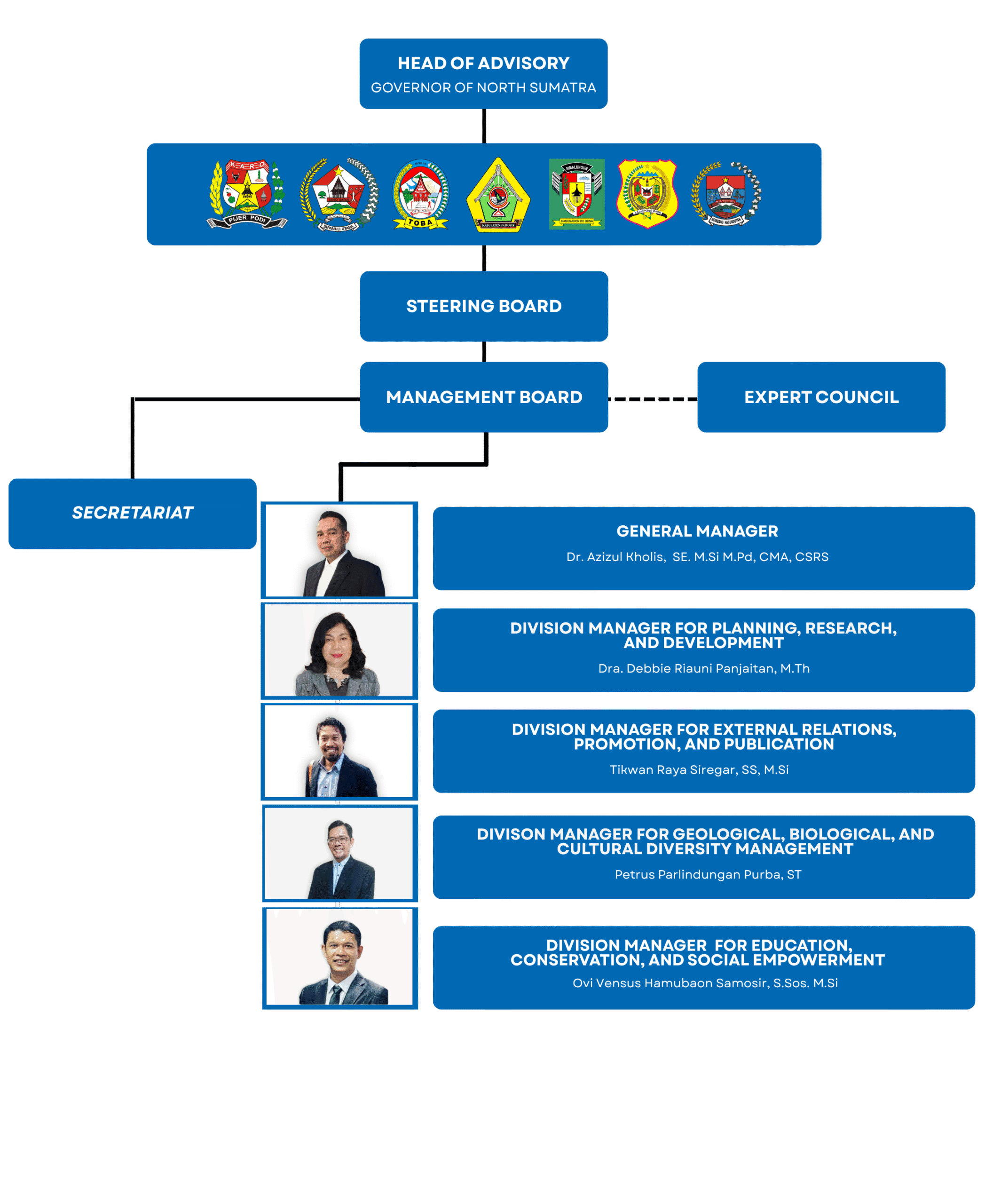 Organisasi Badan Pengelola Geopark Kaldera Toba disusun dengan struktur organisasi sebagai berikut.